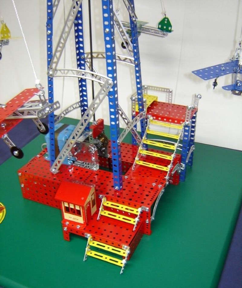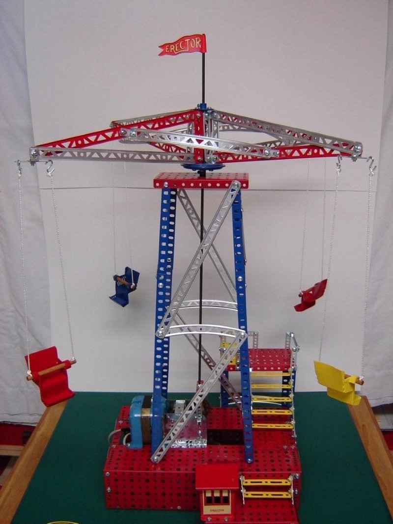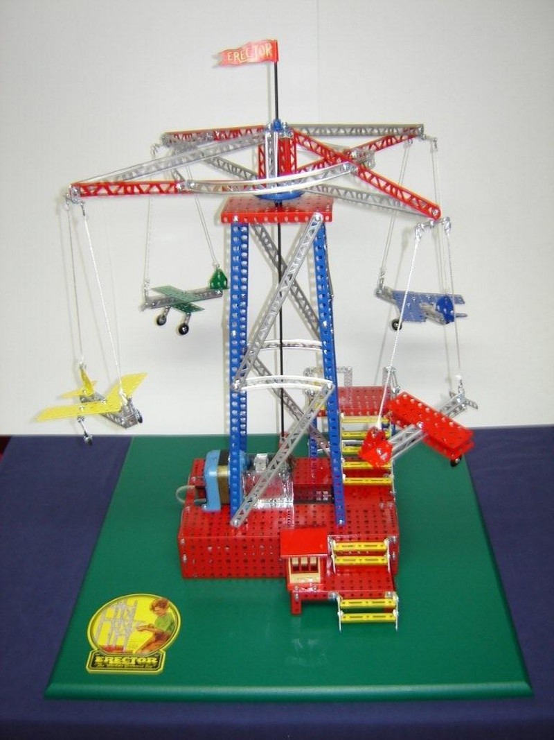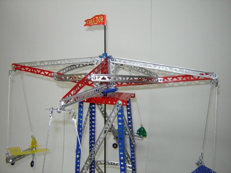 This model was originally constructed as an airplane ride only. The planes were made to give a more realistic aircraft look. A few Mecanno parts were used for the wings and the tail assemblies. Also, I added a few extra features to the model. It was built with spare parts that were stripped clean, primed and painted the various colors that Gilbert used over the years.