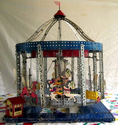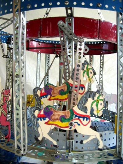 Recently I was trying to impress one of my grandsons, who is into K’Nex, with the great things I could build with Erector sets. I showed him my carousel. He was not too impressed. In fact he had built one with his K’Nex and it had tandem horses. The only concession that he made was that Erector used screws and nuts so it held together better. So, I had to meet the challenge and modified my carousel to have tandem horses. This is how it was done.