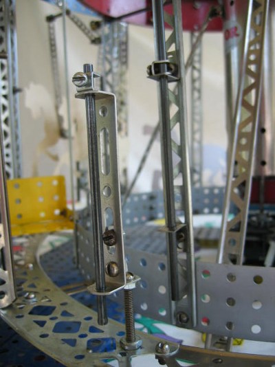 To make room for the tandem horses, the original horses were moved in by replacing the 7 1/2” drive rods with 7” ones and replacing the guide rod brackets with CH Right Angles. The outer guide rods are held in place with N long double angles mounted to the EZ outer bottom ring with O Pawls and S57 1 3/8 screws. The horses are attached to the guide rods with O pawls as before.