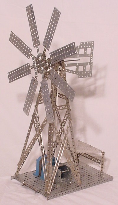 Fred Writes: I based this on the model in the Erector book, but when it came time to do the blades I thought I would try something different. I used 8 of the MF flat plates instead of the B girders shown in the book. I now have an impressive looking blade assembly that unfortunately is out of proportion with the tower! My next idea is to rebuild the tower about twice the height, to make it more in proportion with the blades, maybe next year. Also want to relocate the motor under the shed. Probably should also twist the blade mountings to get some pitch on the blades.