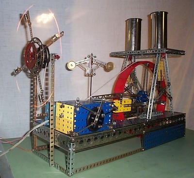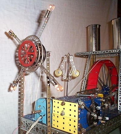 The Giant Power Plant is a model with lots of action. This is the second time I have built it. I wanted to add even more action, so I added a fan (or is it a windmill) driven off the back shaft of the motor. I also added lights on the ends of the fan blades that are connected with a repro commutator. This makes an interesting effect of a ring of light. The picture catches the blades in stop action, but shows part of the ring. I think this is because the light from the bulbs is captured all the time the camera’s “shutter” is open, but the flash is on for just a small portion of this time and catches the blades in freeze action.