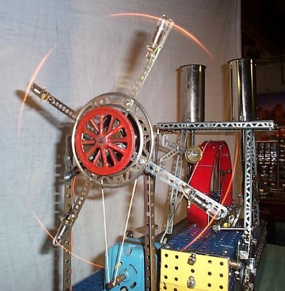 This time I had the luxury of a newer manual that gave detailed directions for building it. This was a great help in certain areas. Last time I just had the usual parts annotated pictures. One thing that I found out was that the motor setup as shown was too slow. Gearing for 3 times the speed gave a much better effect. Also the governor was very much too slow to give any action. Driving at the higher speed and using a P7 drive wheel instead of a motor pulley, allowed the governor to fully extend as shown.