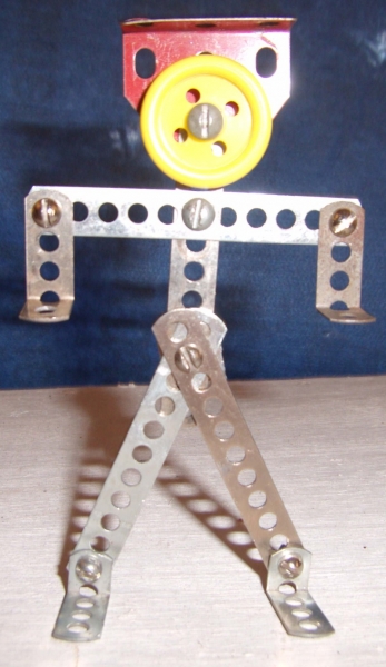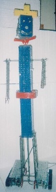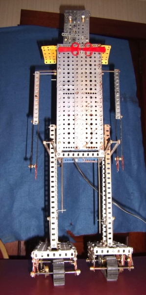 This robot stands 4 feet tall. It walks and turns right and left, has lighted eyes, swinging arms and a motor and track to run each foot.
