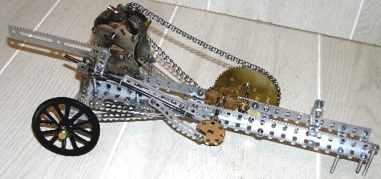 Larry writes: Attached are a few pictures of my latest little gadget. This is the Drag Saw model which I built from a 1929 7.5 White Truck Set. It took about 2 hours to build and runs great. I have powered it here with an A.F. No. 2 transformer because my dry cells have gone dead. I used a scrap piece of closet rod which was already cut for my log. It is a bit large, but a quick modification at the front holder screws took care of that. I also substituted spoke wheels and removed the tie rod from an old MI steering unit. A building tip: Placing a BH solid collar on each side of the G strip behind the BT disc helps eliminate a lot of binding and blade drifting while running. Oh, one more thing, don’t install the P13 & CJ gears on the wrong axle as I first did. That blade was really moving!