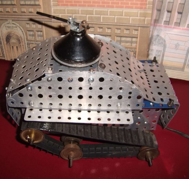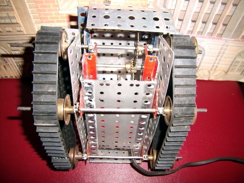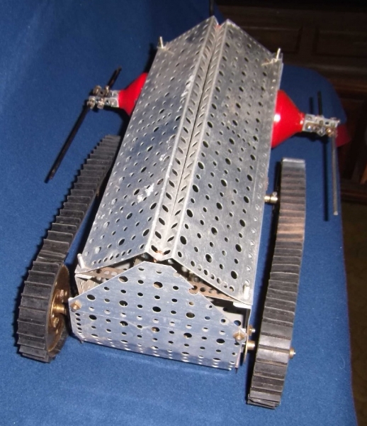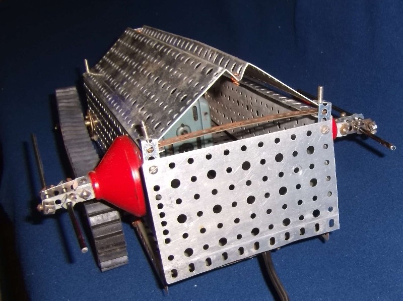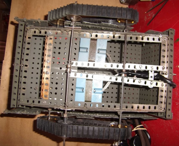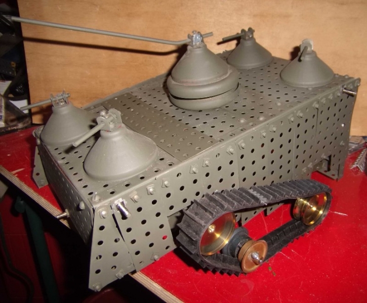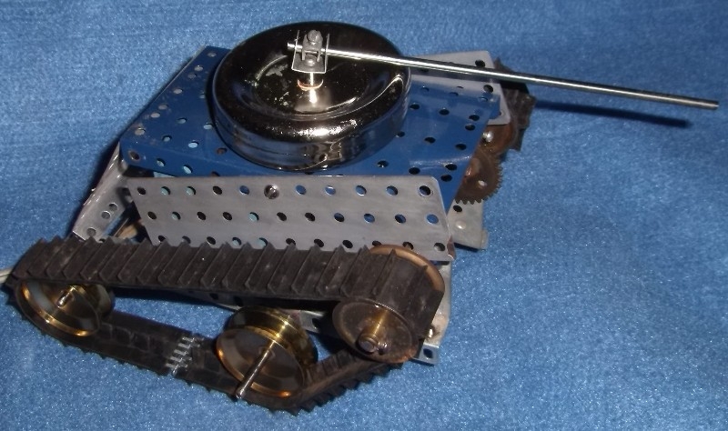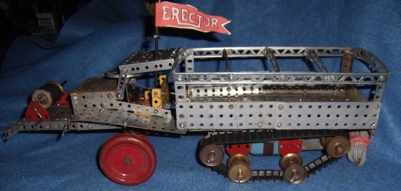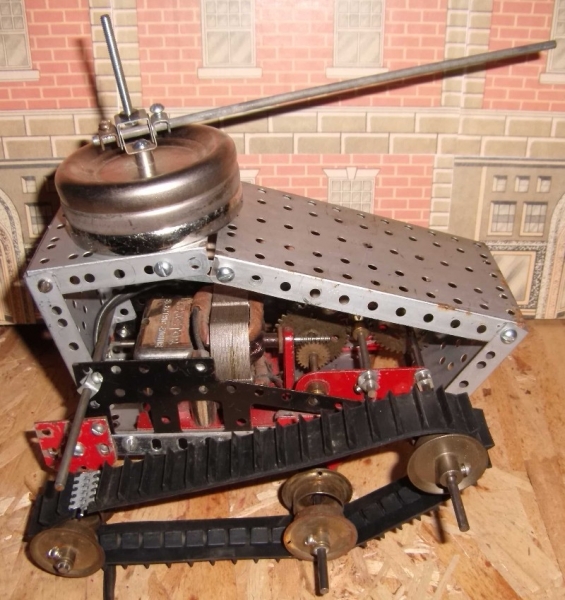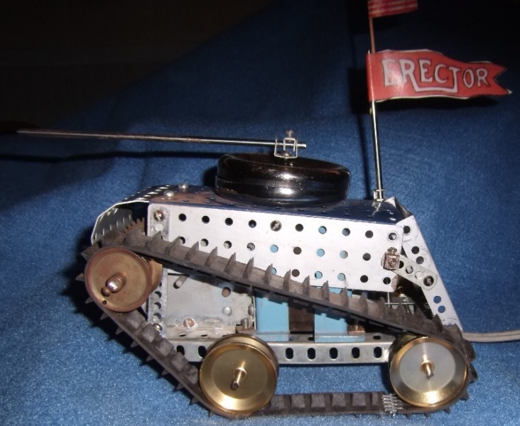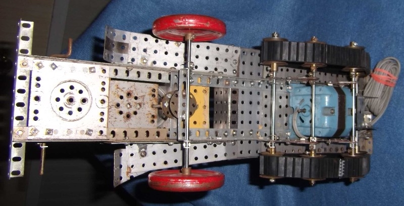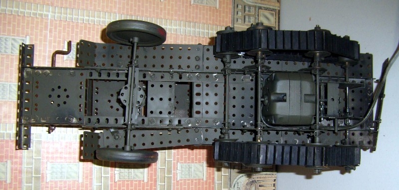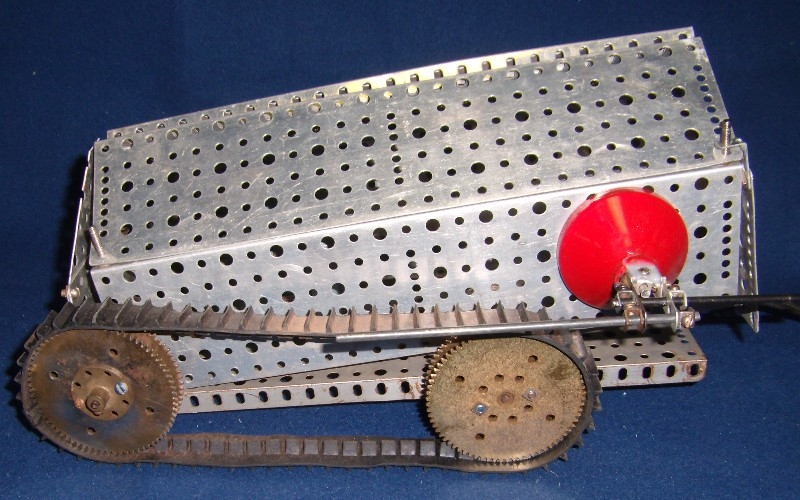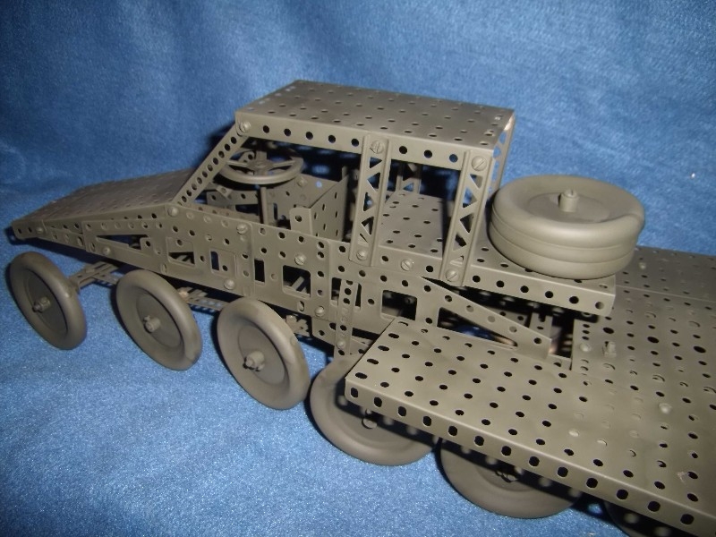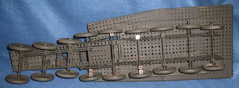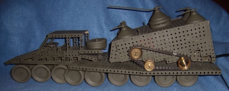 This tank runs with A49 motors. One runs each track with switches so you can steer it by turning off one motor and letting the other track pulls the tank around. The axle shafts are split to allow this independent operation. It has 4 NX pulleys and 4 Z pulleys. There is a matching Transport Truck for the tank with 6 wheel steering.