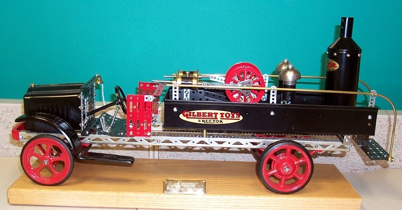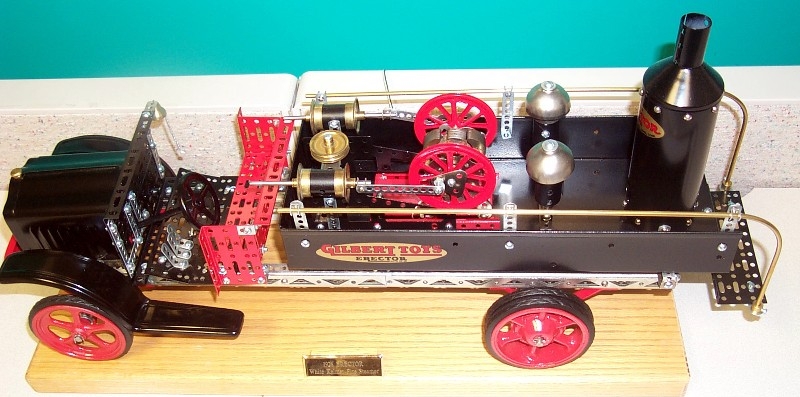 Craig writes: Here are pictures of a 1926 Erector Kelmet Fire Steamer that I built about a year ago when I was constructing a lot of 1920’s Erector models. There are reproduction Kelmet wheels from Frank Usinski and 1926 side frame girders purchased from Al Ludvisgen. All parts were taken down to bare metal, primed and top coated with 4-5 coats of paint. The motor and steam pistons operate and move in synchronization when voltage is applied to the motor. These are on display in my office at work. The solid oak base and brass engraved nameplate really make this truck stand out. It was painstakingly built with much attention paid to the detail.