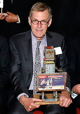 Jeff Marsted and David Gilbert accept award for induction of their grandfather, A.C. Gilbert, into the American Manufacturing Hall of Fame from John Ratzenberger (left) and Barbara Johnson (right). (Photo courtesy of Dan Wisneski)