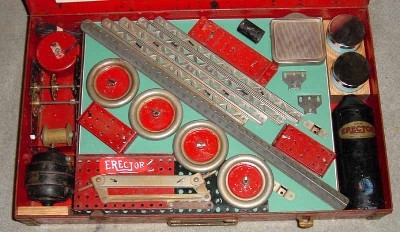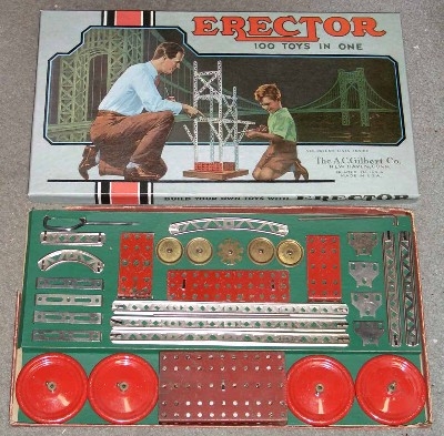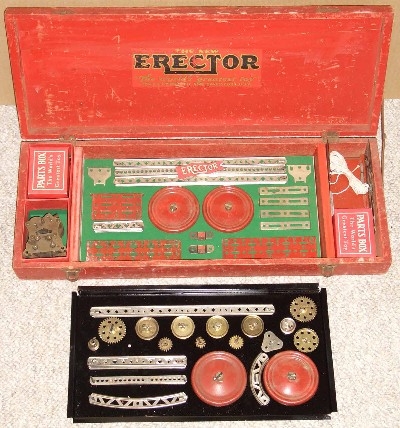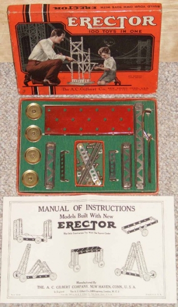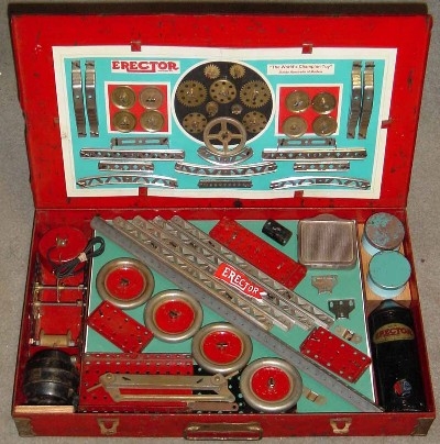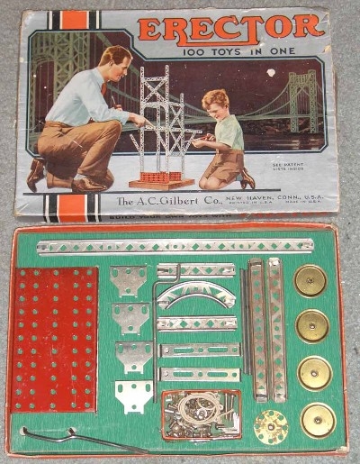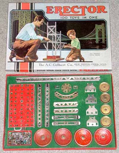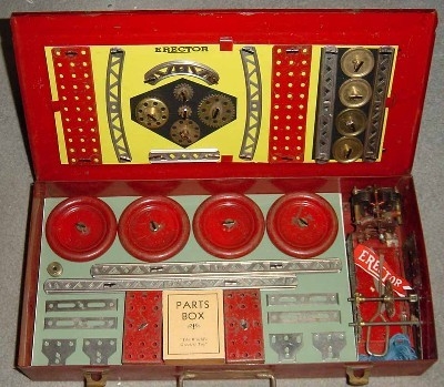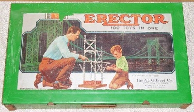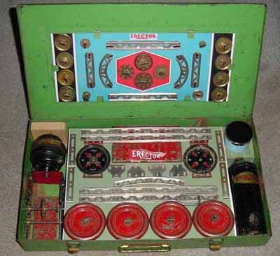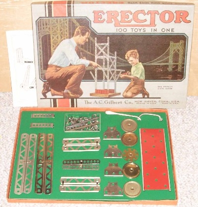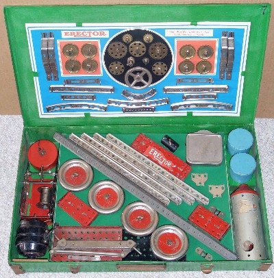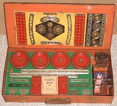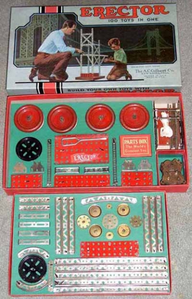 Type II sets, from 1924-1962, are characterized by their 5/8” wide trussed look girders. Many specialized parts designed to build specific models were introduced from 1924-1932. The Great Depression put a damper on elaborate sets during the early to mid-1930s. By the late 1930s, sets were on the increase in size again. Very few metal sets were produced during World War II, most likely sets put together from leftover parts. After WWII, sets started small again, but gradually increased starting in 1948 with the introduction of the No. 12 1/2 Walking Giant set. Sets and models remained mostly unchanged until 1958 when Musical Sets hit the scene for this year and 1959. The end of the toy was in site as the quality of the sets started to deteriorate until the final demise in 1962.